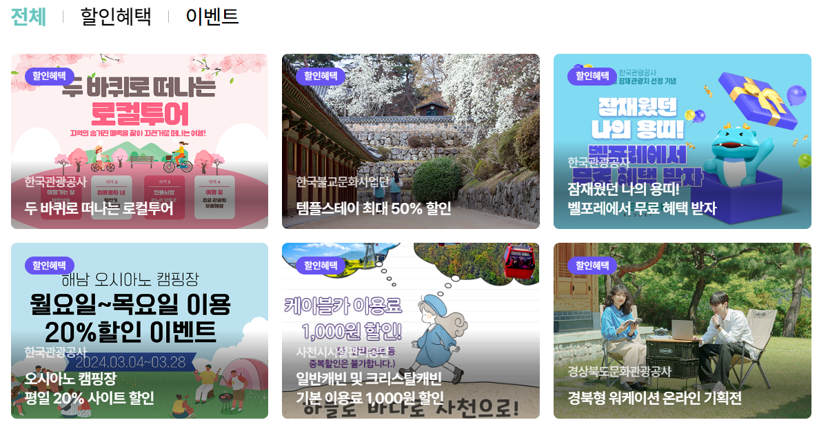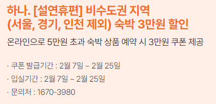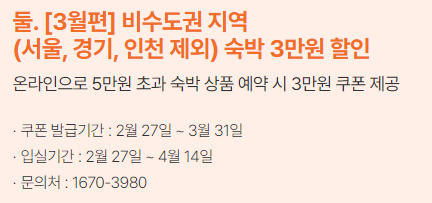 숙박할인은 두가지 이벤트가 진행 중에 있으며 모든 이벤트가 비수도권 지역(서울, 경기, 인천 제외) 숙박 3만원 할인 이벤트를 하고 있습니다. 각 이벤트가 신청과 사용기간이 다르기 때문에 잘 확인하시고 이용하세요