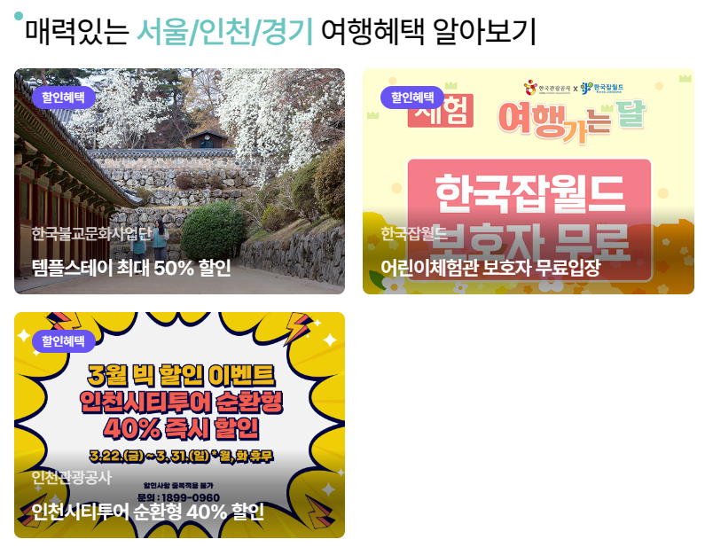 교통비 최대 50% 할인에 숙박비는 최대 3만 원 할인 게다가 국내 여행상품 40% 할인 등 풍성한 할인을 받으실 수 있는 3월은 여행가는 달 행사가 준비되어 있으니 이 기회를 놓치지 말고 따뜻한 봄날 좋은 분들과 좋은 시간 만드시길 바랍니다.
