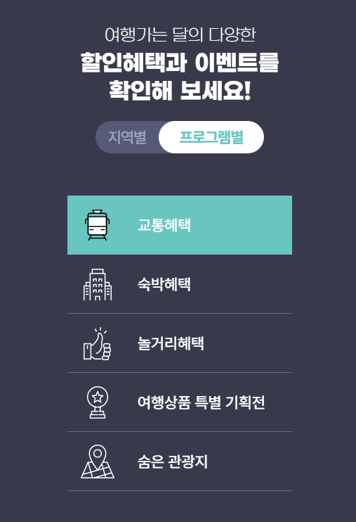 두 번째는 프로그램 별 검색으로 행사기간 동안 교통, 숙박, 놀거리, 여행상품 등 지역별 프로그램과 연계된 추가 할인이나 독립 할인 등에 대한 정보를 확인하시고 예약하실 수 있습니다.